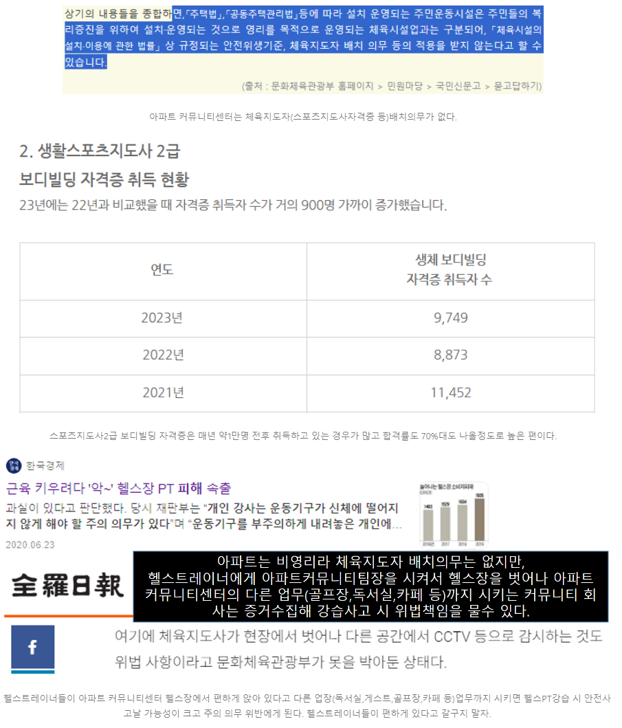 | 현행 체육시설법 시행규칙 제23조에 따르면 아파트 커뮤니티 센터 내 헬스장,수영장,골프장 등은 비영리 시설이라 헬스,골프,수영장 등 체육관련인들이 의무고용이 아니다. 즉, 체육시설만 냅두고 운동관련인들은 다 짤라도 그만이다. 만약법이 개정된다면 골프트레이너, 수영강사, 헬스트레이너는 각 사업장에 배치해 안전관리해야 하며 운동선수가 직접지도하며 매시간 배치되었다는 근거를 남겨야 하며 지도가 아닌 센터 경영이 주목적인 팀장으로 채용은 법위반(팀장은 경영목적 채용으로 명확성의 원칙 위배)이 될 소지가 높다. 대신, 소방안전관리자들이 의무고용으로 아파트 안전을 책임지고 있다. 생활스포츠지도사의 경우 대부분 기능사와 비슷한 대우를 해주고 있기에 아파트도 보디빌더들을 사원급 정도로 뽑는다. ■건강운동관리사(실기합격률약10%) = 구명칭(생활체육지도자1급) = 기사급(주택관리사,컴퓨터활용능력1급)과 비슷한 합격률 ■생활스포츠지도사1급(실기합격률약50%) = 구명칭(생활체육지도자2급) = 산업기사, 컴퓨터활용능력2급,워드프로세서1급과 비슷한 합격률 ■생활스포츠지도사2급(실기합격률약70%) = 구명칭(생활체육지도자3급) = 기능사, ITQ마스터 ,MOS마스터와 비슷한 합격률 (아래 시설공단채용참고) ■기타 보디빌딩 민간자격증 헬스트레이너지도사1급 등(합격률약80~90%) = ITQ단일, MOS단일 |