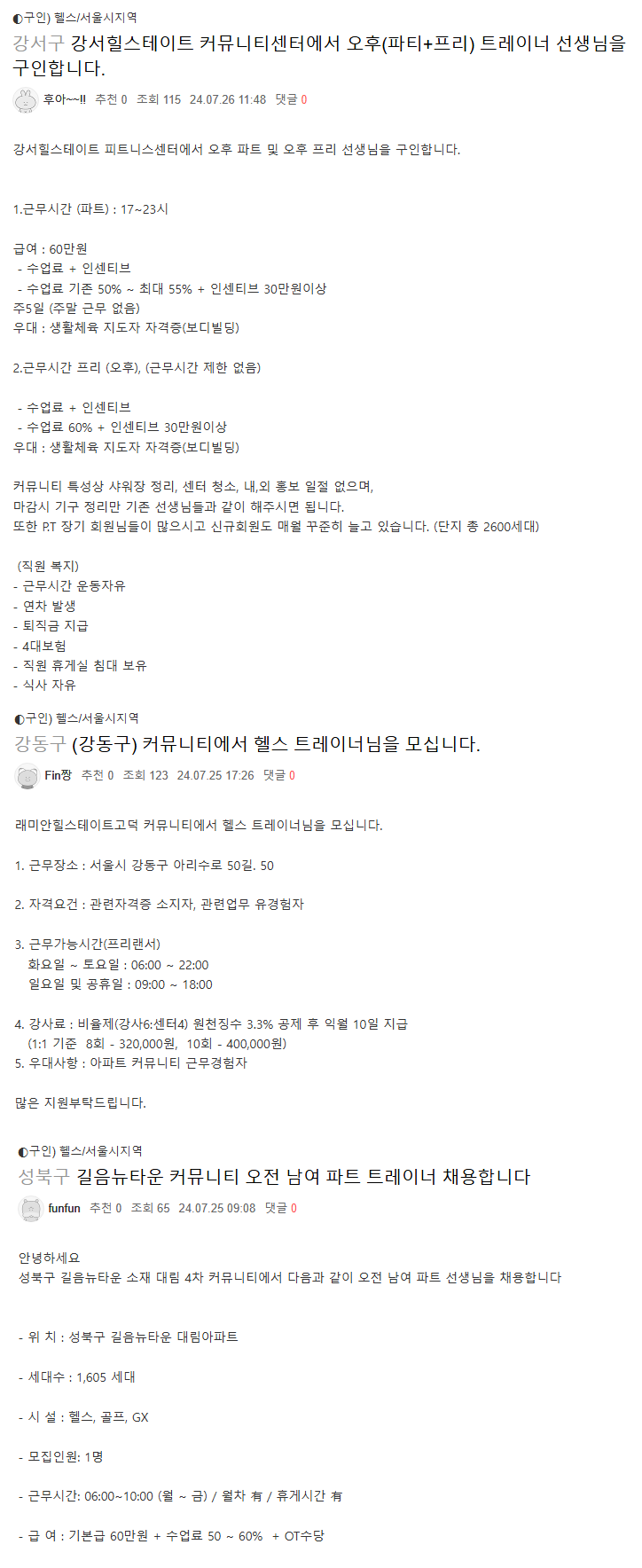 아래는 헬스트레이너 기본급 0원프리랜서 or 정규기본급60만원+프리랜서 방식으로 아파트관리비아끼는 사례이니 참고 바라며 헬스트레이너 기본급만 안줘도 안내,미화,저축금 등으로 돌려서 경쟁력이 생긴다. 요즘은 수주 경쟁이 치열해져서 헬스 기본급 주며 아파트관리비 축내는 회사는 수주하기도 점점 힘들어 진다. 헬스들 기본급줘서 잘뽑아봐야 사설헬스장프로필보다 좋을 수가 없다.