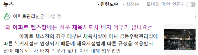 Tip_아파트 커뮤니티센터 헬스장은 비영리라 스포츠지도사가 법률상 의무고용이 아니다. 즉 개인헬스장처럼 자격증없이 바디프로필사진 몸만 좋아도 아파트헬스트레이너 시켜도 된다는 뜻이다. 자격증없어도 아파트 카페 바리스타하는 것과 같다.