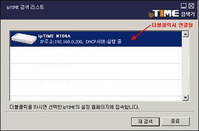 3) ipTIME 검색기를 실행한 후 검색된 공유기를 더블클릭하면 설정화면에 접속됩니다.