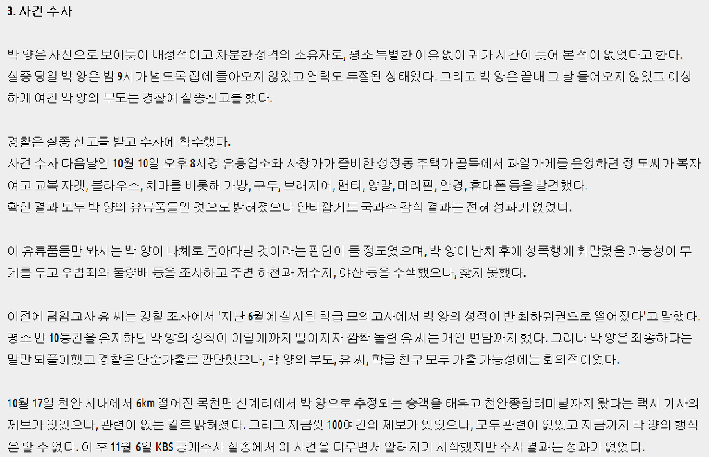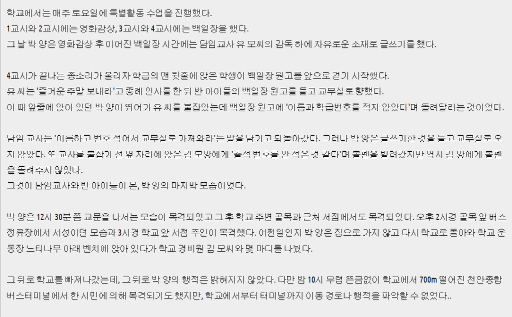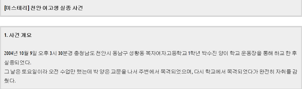 [미스테리]천안 여고생 박수진(여17세) 실종 사건 작성자이병숙|작성시간16.12.22|조회수249 목록 댓글 0 글자크기 작게가 글자크기 크게가 [미스테리]천안 여고생 실종 사건 다음검색 현재 게시글 추가 기능 열기 북마크 공유하기 신고 센터로 신고 댓글 댓글 0 댓글쓰기 답글쓰기 댓글 리스트