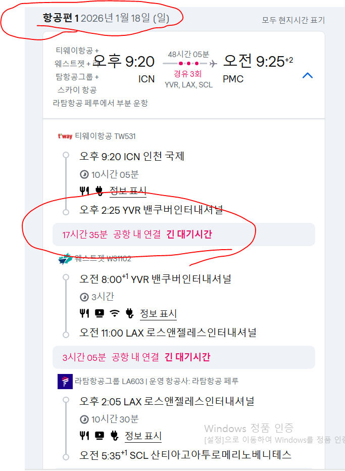 이걸루 가야겠네. 싼거는 뱅쿠버에서 17시간반을 대기해야 하는데 그건 너무해.