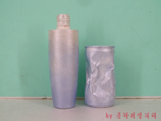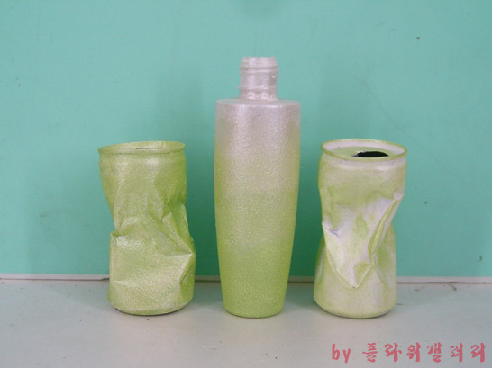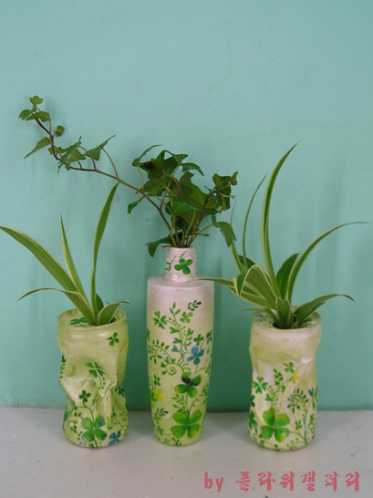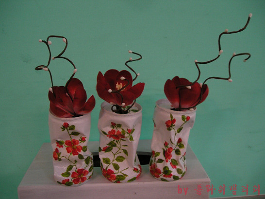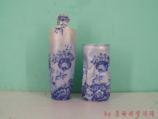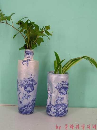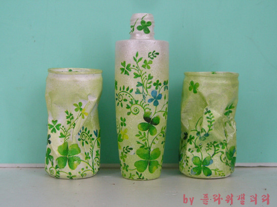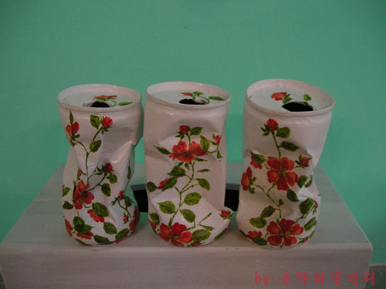 버려진 화장품병과 찌그러진 캔을 냅킨공예로 새롭게 태어난 작품..