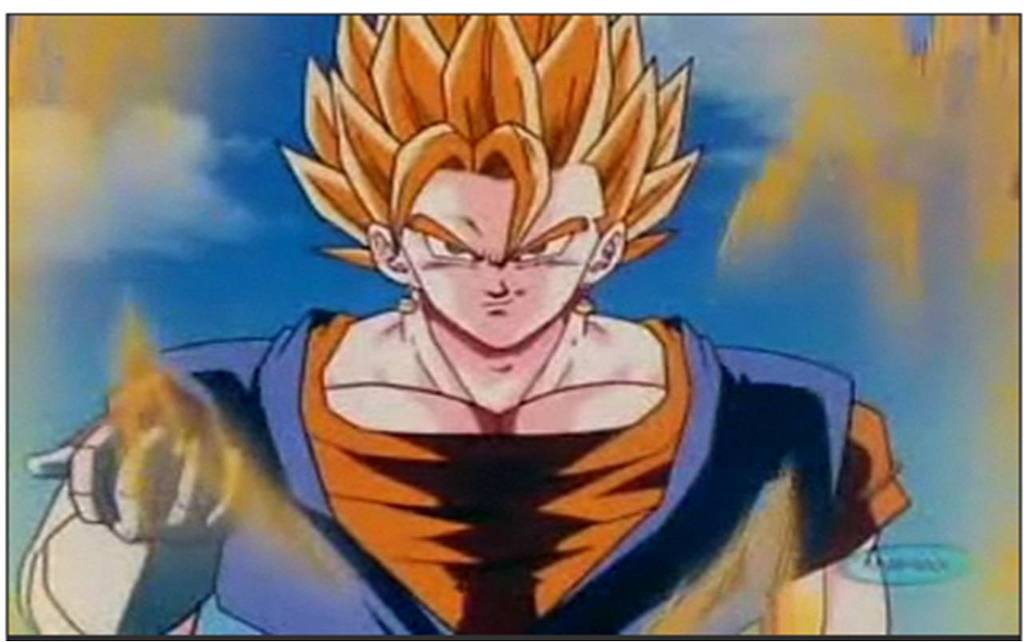 포타라 귀걸이로 합쳐진 후 초사이언단계가 되는 상태입니다. 기폭발과 동시에 대량의 스파크가 일어납니다.