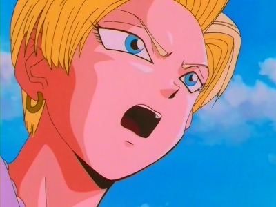 오공의 위기의 순간, 슈퍼17호 앞에 18호가 나타나 자신을 죽이지 못한 이유를 설명하라며 자신의 몸에 폭탄이 있다고 한번 쏴보라고 합니다.