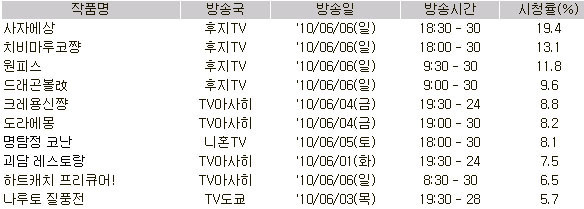 일본 애니메이션 시청률 드래곤볼 카이 9.6 작성자레비아♪|작성시간10.06.12|조회수168 목록 댓글 1 글자크기 작게가 글자크기 크게가 다음검색 현재 게시글 추가 기능 열기 북마크 공유하기 신고 센터로 신고 댓글 댓글 1 댓글쓰기 답글쓰기 댓글 리스트 작성자magicgate | 작성시간 10.06.12 쪕..... 댓글 전체보기