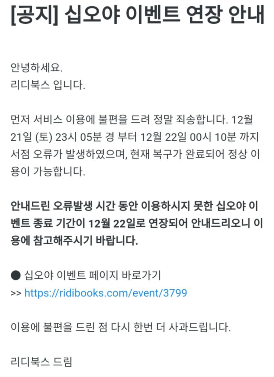 리디북스에서 제공해 드리는 서비스 및 이벤트가 아래와 같은 사유로 인하여 부득이하게 변경될 예정입니다. 안내드리는 내용을 통해 향후 서비스 이용에 참고 부탁드리겠습니다.