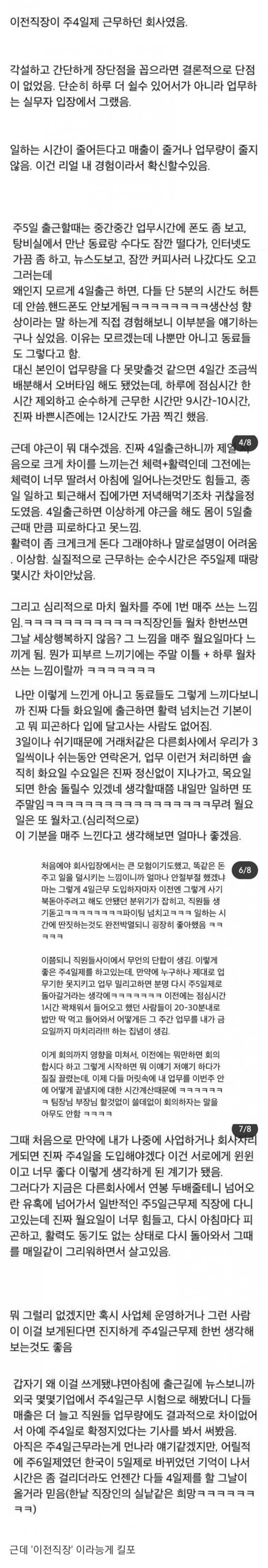 [기타]주4일 근무자 후기 작성자쿨피스|작성시간21.01.21|조회수89,057 목록 댓글 4 글자크기 작게가 글자크기 크게가 다음검색 현재 게시글 추가 기능 열기 북마크 공유하기 신고 센터로 신고 댓글 댓글 4 댓글쓰기 답글쓰기 댓글 리스트 작성자엘라스틱 | 작성시간 21.01.21 주3일 답댓글 작성자자유인 | 작성시간 21.01.21 그러면 2교대 근무하지 않을까 싶네요. 작성자무노보노 | 작성시간 21.01.22 저도 그렇게생각해요! 작성자골든프리저(천사) | 작성시간 21.01.23 역시 주 4일로 바껴야 돼 ㅡㅡ 댓글 전체보기