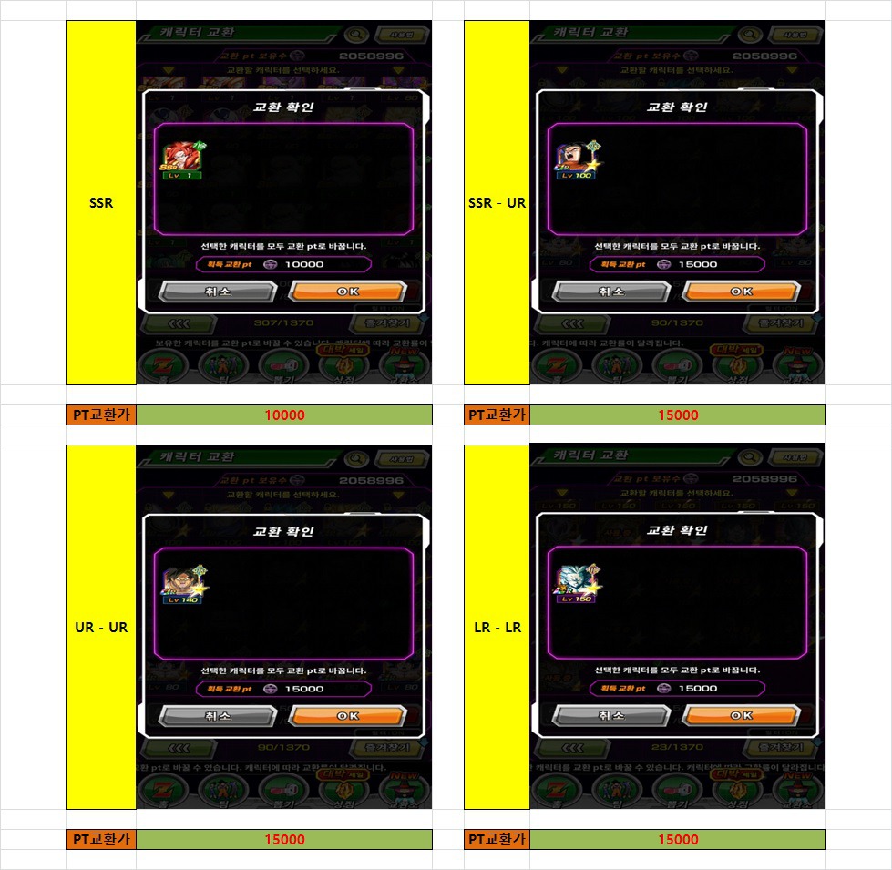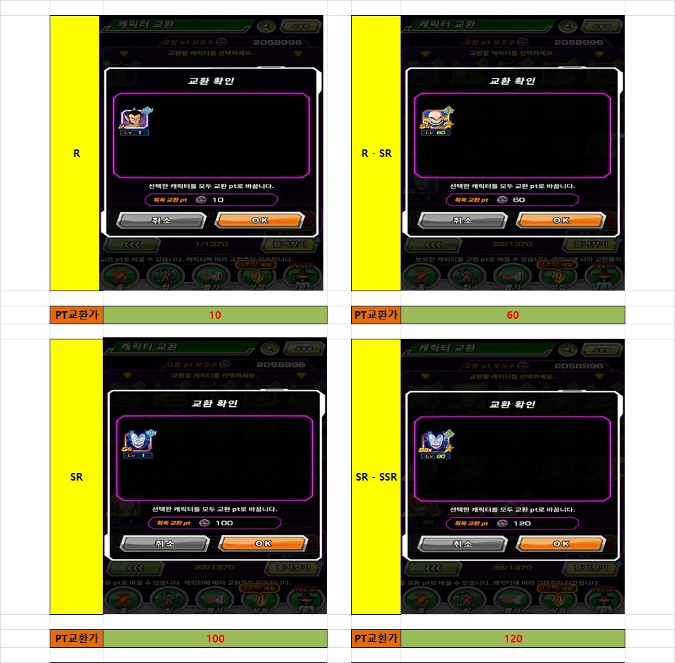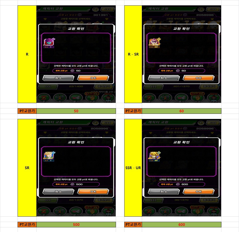 무료/유료 카드 교환시 바바포인트 얻는 PT 목록