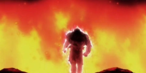 여기서 나카무라 료타의 역할을 확실히 짚고 넘어가지 않을 수가 없습니다. 액션 애니메이션의 퀄리티는 단순히 작화진의 기량만으로는 부족합니다. 설령 작화와 액션 자체가 좋아도 연출과 콘티가 별로면 전투씬의 긴장감과 스케일을 죽일 수 있기 때문이죠. 가장 대표적으로 ‘야마무로 타다요시’ 감독의 초짜스러운 연출로 실망스러운 결과물이 되어버린 ‘부활의 F’ 극장판이 있습니다. 나카무라는 콘티 아티스트로서는 인상적인 카메라 앵글 전환으로, 감독으로서는 안정적인 페이싱과 좋은 타이밍의 배경음악 삽입으로 이 회차를 크게 빛냈습니다. 위에서 살짝 언급했던 전반부 지렌의 분노 장면이 대표적인데요. 엄청난 전투 후 갑작스러운 침묵과 불덩이 사이에서 실루엣부터 서서히 모습을 드러내는 지렌의 모습은 보는 사람들로 하여금 긴장감을 주기 충분하며 오공의 파란 오오라와 반대되는 지렌의 빨간 오오라는 둘을 제대로 대비되게 해줍니다.