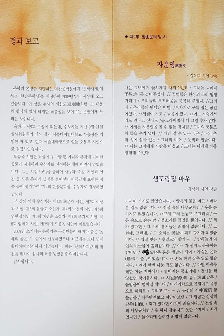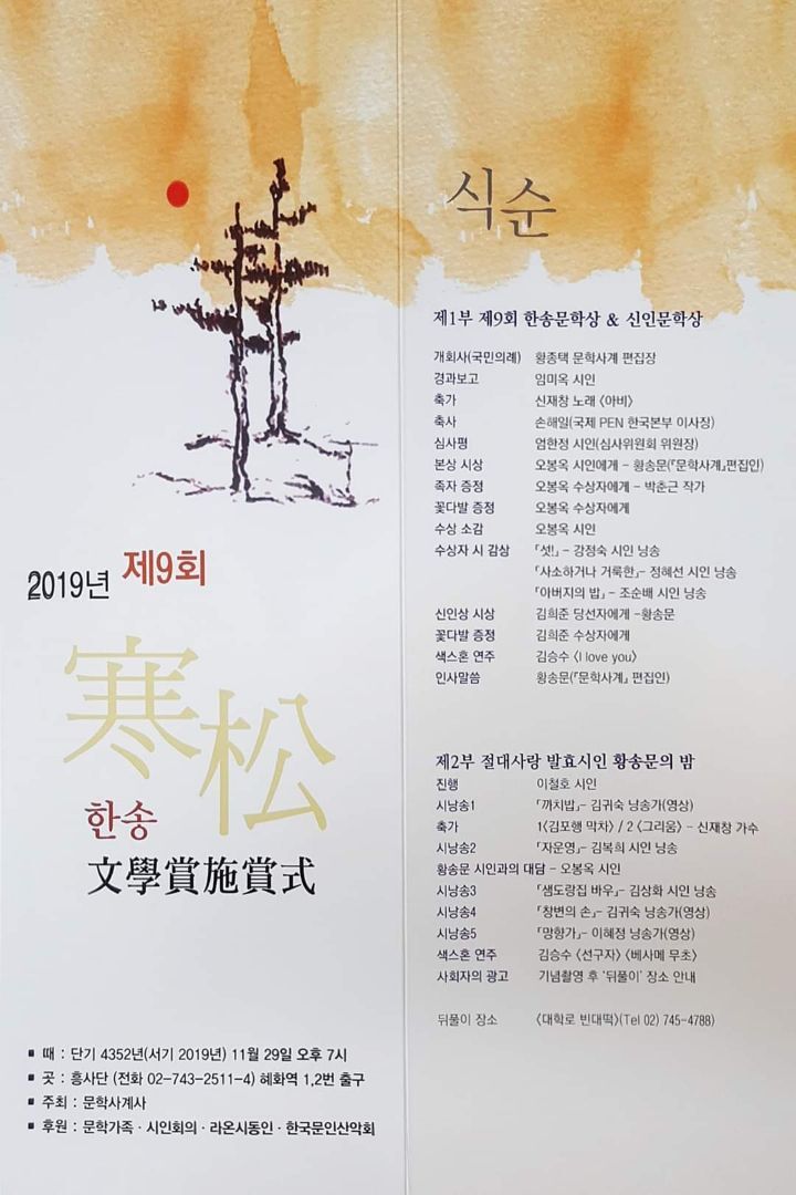 1부에서는 2019년 제9회 한송문학상 수상자 오봉옥 시인과 신인문학상을 타는 김희준 당선자에게 시상하고, 이어지는 2부 절대사랑 발효시인 황송문의 밤에서 여러 시인 낭송가들의 축하시 낭송과 축하 연주를 합니다.