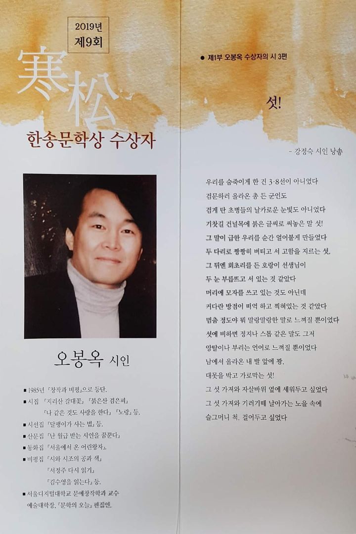 □2019년 제9회 한송문학상 수상자 : 오봉옥 시인