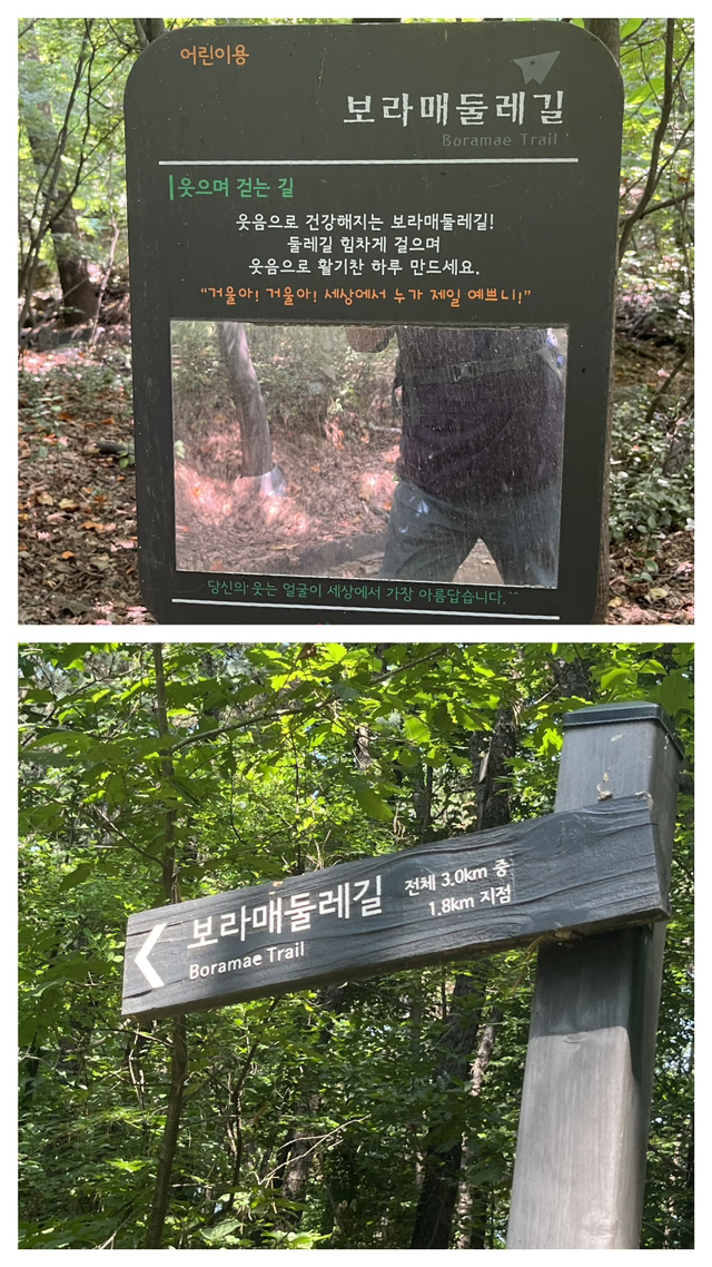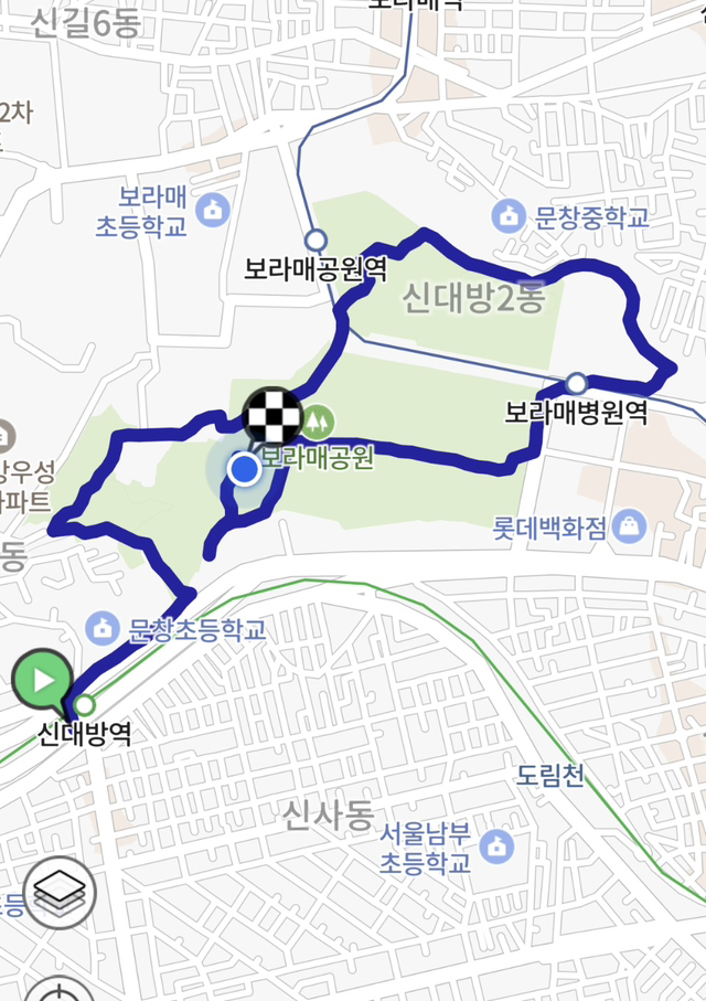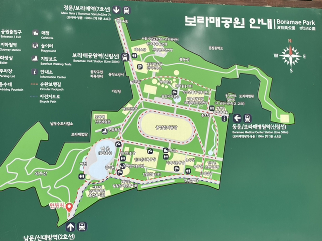 코스:신대방역>보라매 둘레길>보라매법당>보라매안전체험관>맨발광장>무궁화동산>보라매 병원>보라매호수음악분수대