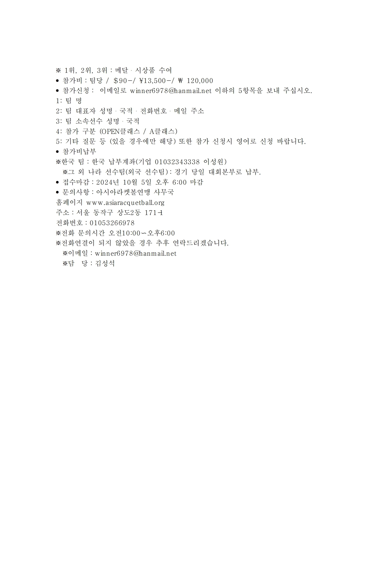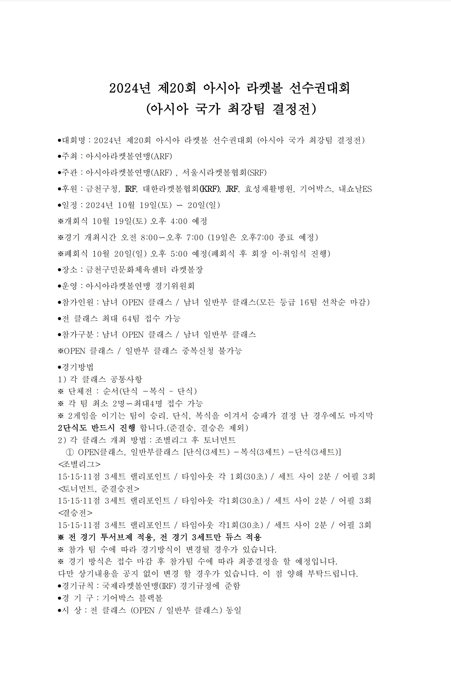 2024년 제20회 아시아라켓볼선수권대회 요강 작성자한환용|작성시간24.09.06|조회수125 목록 댓글 0 글자크기 작게가 글자크기 크게가 다음검색 현재 게시글 추가 기능 열기 북마크 공유하기 신고 센터로 신고 댓글 댓글 0 댓글쓰기 답글쓰기 댓글 리스트