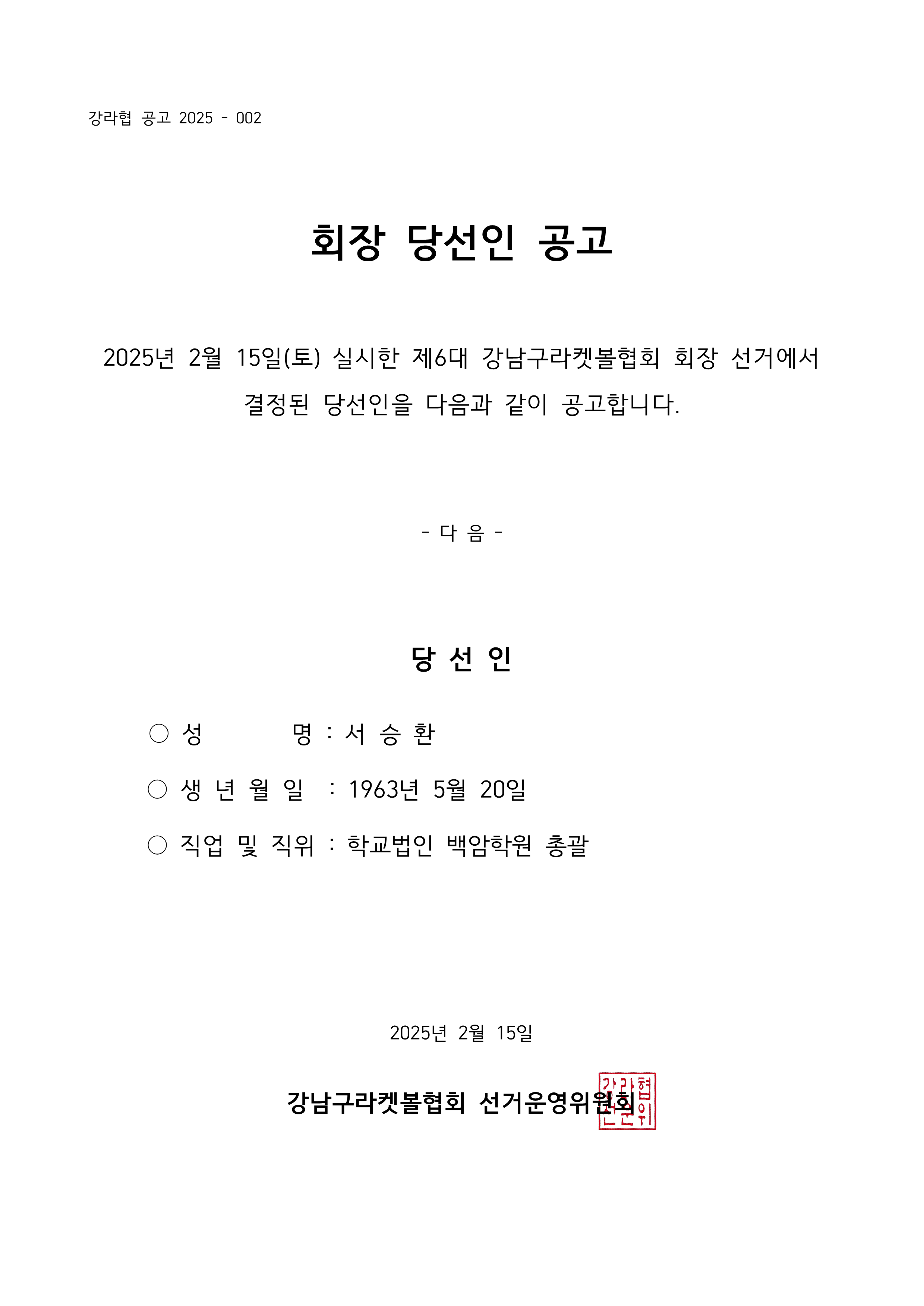 제6대 강남구라켓볼협회 회장 회장 당선인 공고(2025.2.15 실시) 작성자이원형|작성시간25.02.16|조회수102 목록 댓글 0 글자크기 작게가 글자크기 크게가 회장 당선인 공고.pdf42.58KB회장 당선인 공고.hwpx41.39KB 첨부파일첨부된 파일이 3개 있습니다. png 파일 회장 당선인 공고(강라협 공고 2025-002).png 다운로드 etc 파일 회장 당선인 공고.hwpx 다운로드 pdf 파일 회장 당선인 공고.pdf 다운로드 다음검색 현재 게시글 추가 기능 열기 북마크 공유하기 신고 센터로 신고 댓글 댓글 0 댓글쓰기 답글쓰기 댓글 리스트