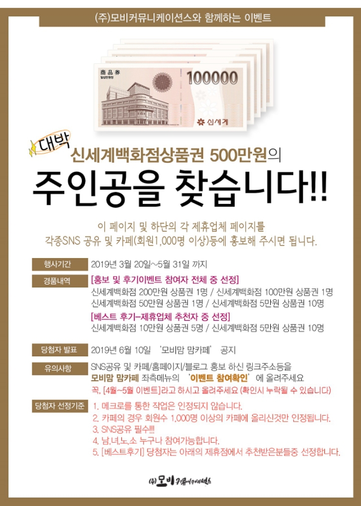 지금 모비맘카페에서 대박이벤트가 진행중입니다! 대박 행운의 주인공이 되세요^^