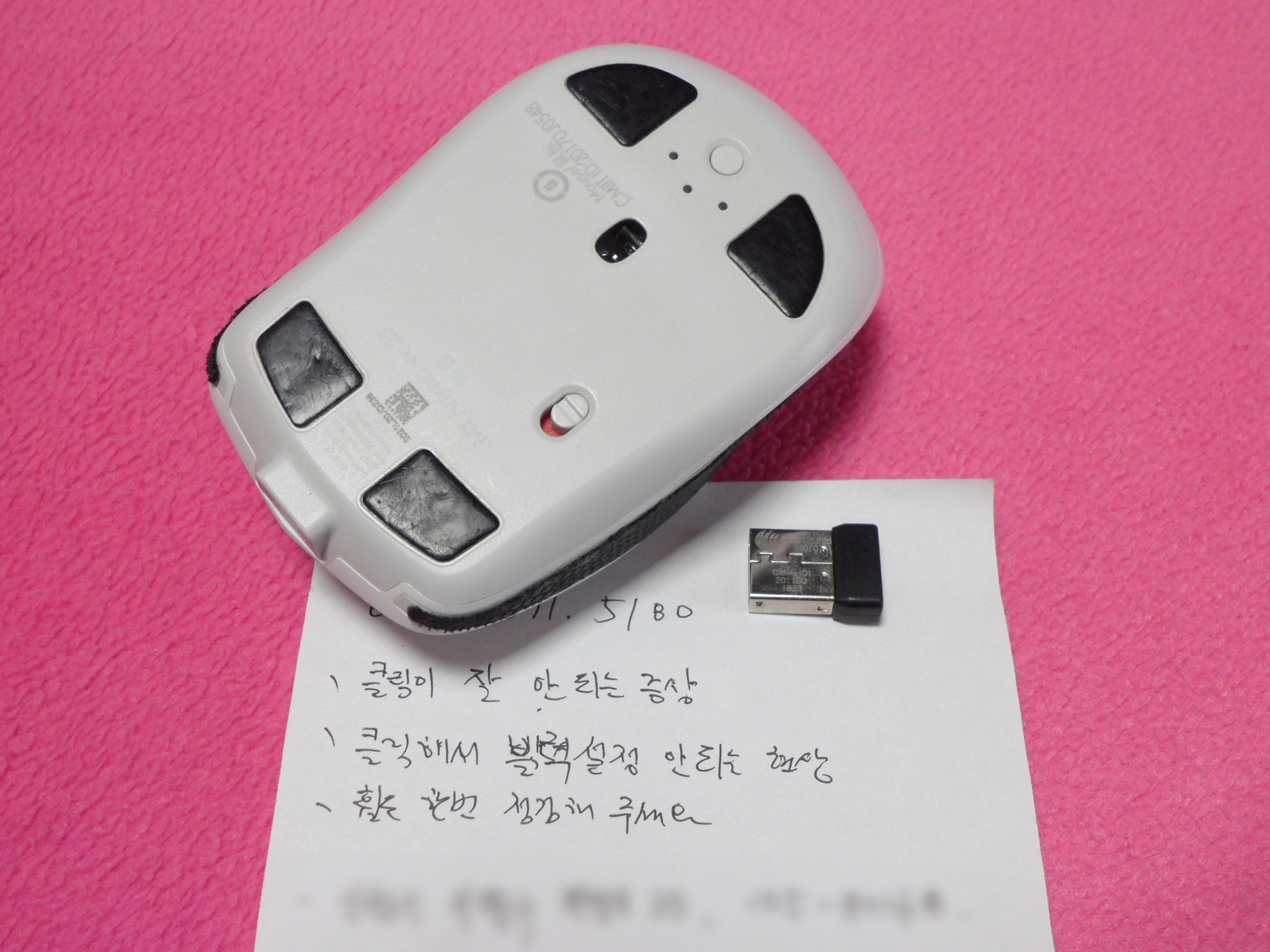 ● 증상: "- 클릭이 잘 안 되는 증상 - 클랙해서 블럭 설정 안 되는 현상 - 휠은 한번 점검해 주세요"