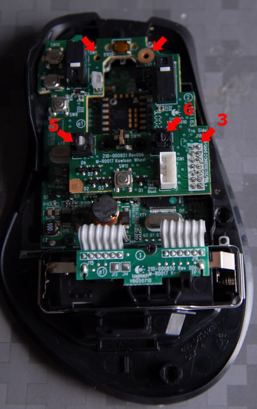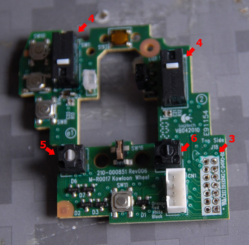 그림5. 상판 PCB을 분리했습니다. 4번 옴론 차이나 D2FC-F-7N(10M) 스위치가 보이네요. 5번 6번은 좌우스크롤 시 휠이 누르는 스위치입니다. 색깔이 다르죠? 5번은 스위치는 딸깍하고 소리가나는 반면 6번 스위치는 딸깍하는 소리가 거의 나지 않습니다. 5번 스위치가 누르는데 더 힘이듭니다. 로지텍에서 일부러 이렇게 디자인했다고 하네요.