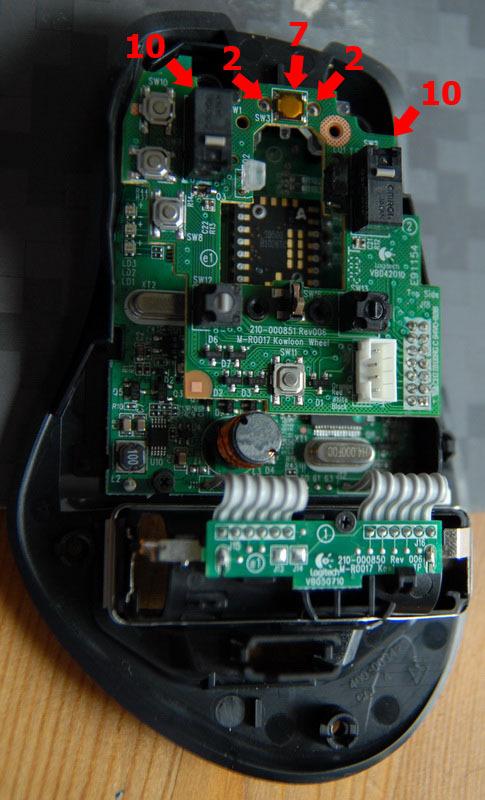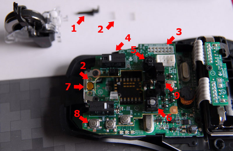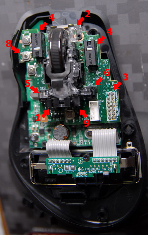 그림2. 마우스의 껍대기를 벗겨내면 다음과 같습니다. 껍대기와 본체와 연결된 케이블(9번 옆)을 제거한 상태입니다.
