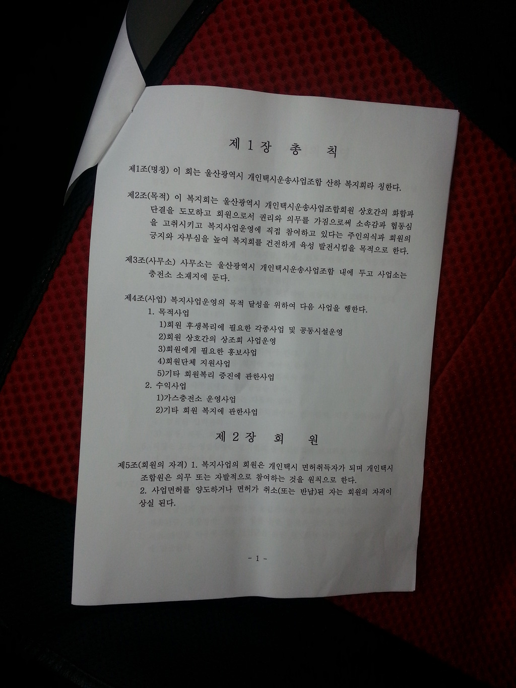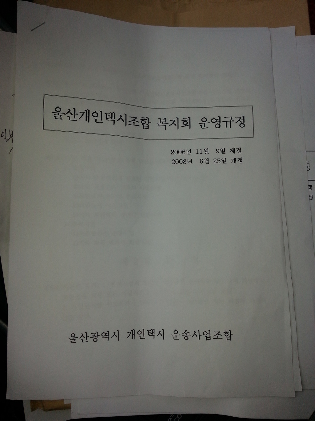 운영규정을 수정하여 울산개인택시조합 이사장이 이사장 출마 공약으로 임기중 조합원복지센타를