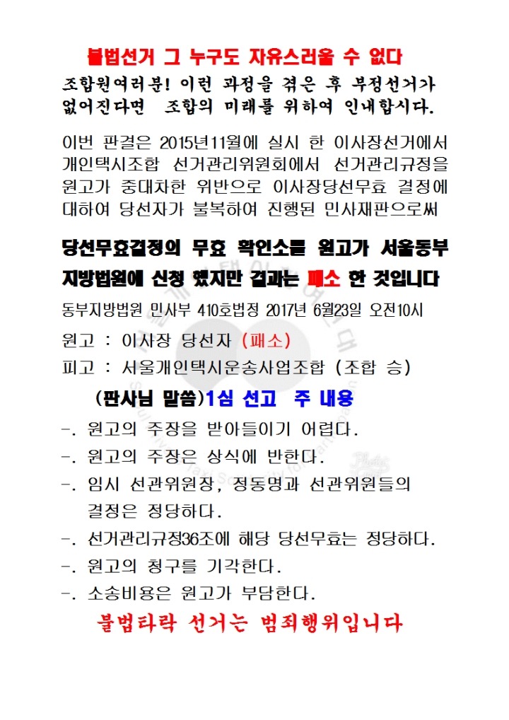 [스크랩] 이사장 당선무효결정의 무효확인소에대하여 작성자돌탑비전택시|작성시간17.06.26|조회수30 목록 댓글 0 글자크기 작게가 글자크기 크게가 2017년6월23일오전10시동부지방법원 민사410호실재판부 판결을 존중합니다 다음검색 스크랩 원문 : 개인택시참여연대 현재 게시글 추가 기능 열기 북마크 공유하기 신고 센터로 신고 댓글 댓글 0 댓글쓰기 답글쓰기 댓글 리스트
