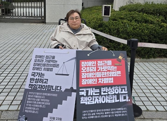 장애인차별금지추진연대 박김영희 상임대표가 7일 대법원 정문 앞에서 장애인 접근권에 대한 국가배상책임 공개변론 대법원 판결 촉구 1인 시위를 하는 모습. ⓒ장애인차별금지추진연대