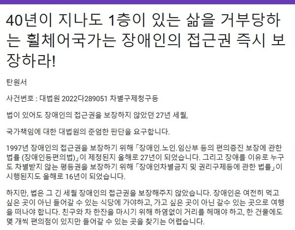장애인 접근 불가한 소규모 시설 ‘국가책임’ 탄원서 모집장애인 접근권 관련 국가배상 사건‥대법원 엄중한 판단 촉구