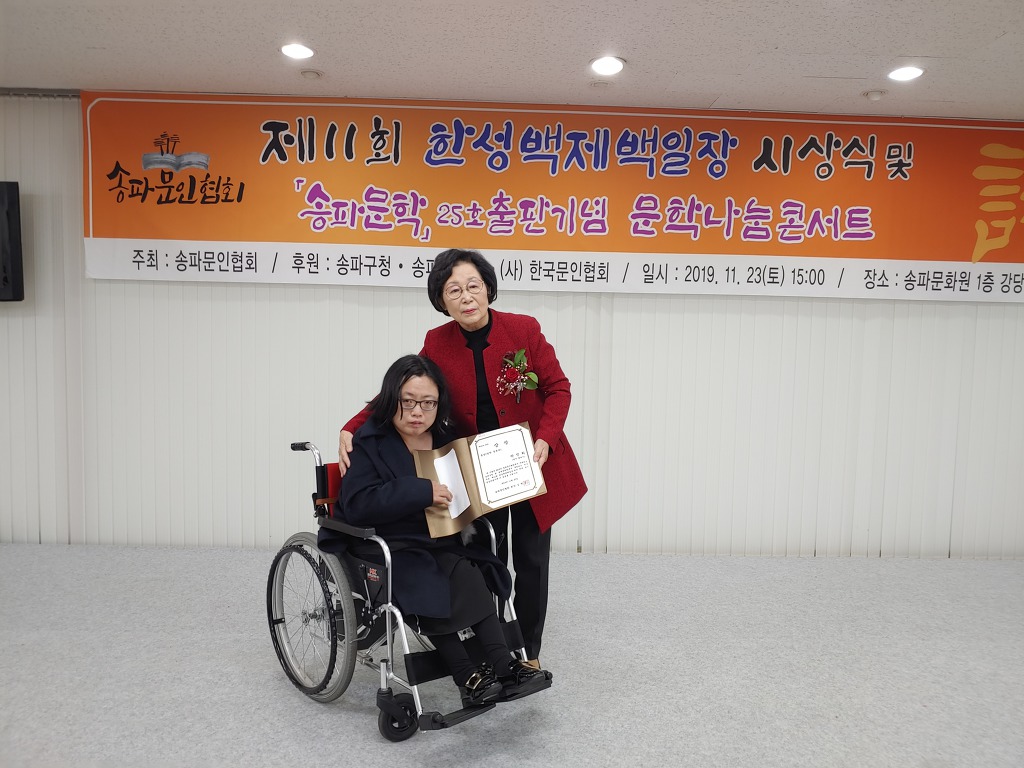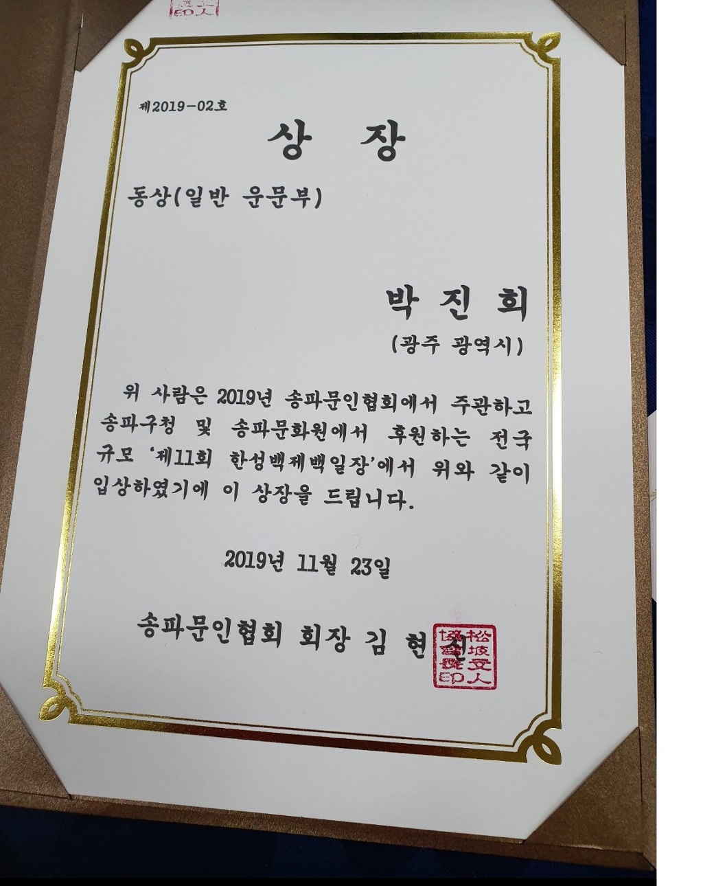 송파문인협회가 주관하고 송파구청, 송파문화원이 후원하는 제11회 한성백제백일장 시상식이 송파문화원에서 열렸습니다. '조용한 행위' 라는 시로 동상(문인협회장상)을 수상하였습니다.