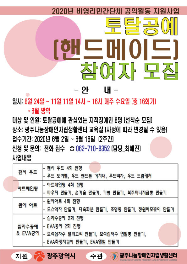 [스크랩] 2020년 비영리민간단체 공익활동 지원 사업 <토탈공예 핸드메이드> 참여자 모집안내
