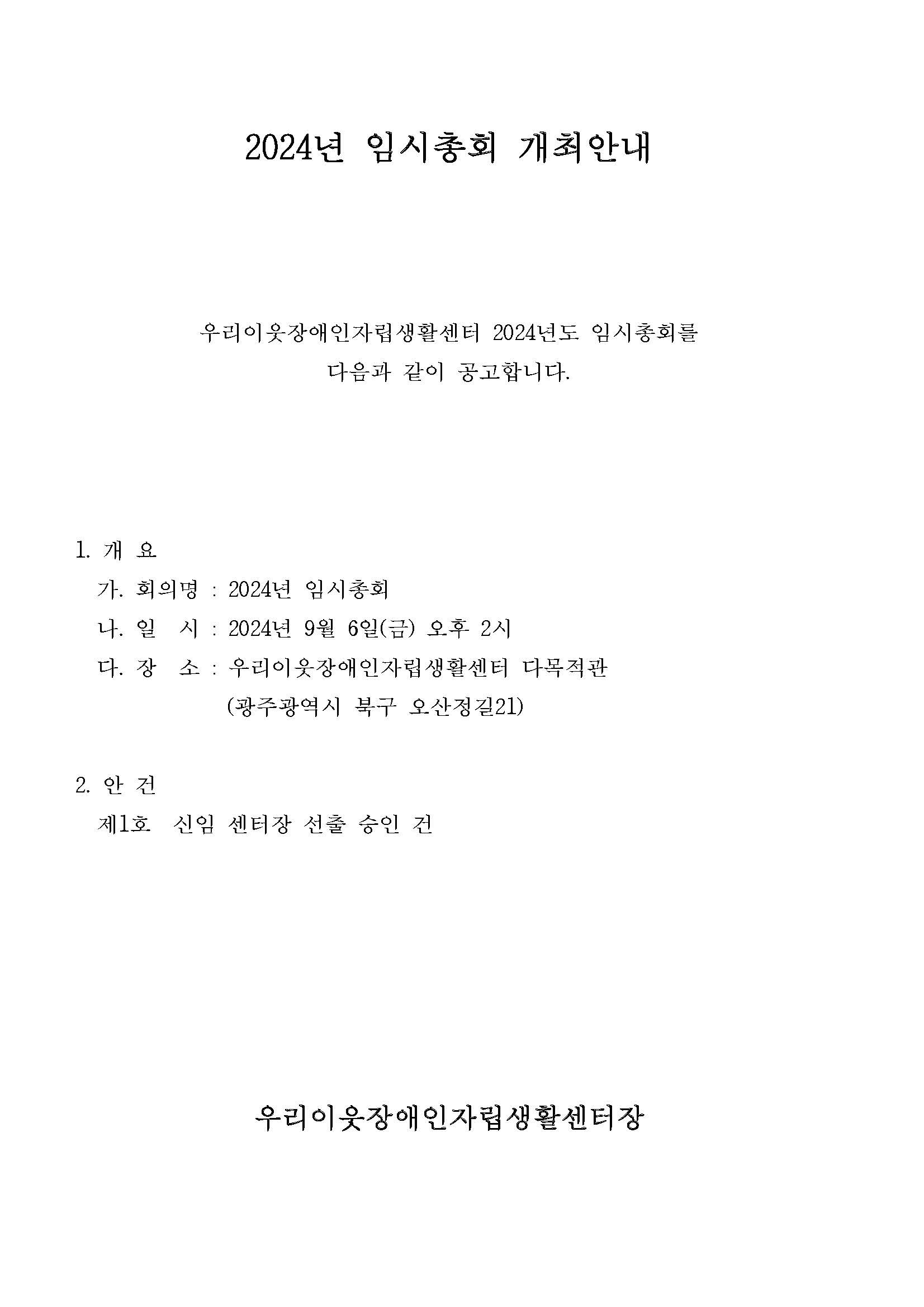 [[공고]]2024 우리이웃장애인자립생활센터 임시총회 개최(9.6.) 작성자우리이웃|작성시간24.08.29|조회수126 목록 댓글 0 글자크기 작게가 글자크기 크게가 우리이웃장애인자립생활센터 임시총회를 개최합니다. 회원여러분의 많은 참석 부탁드립니다. 공고문.pdf21.09KB위임장(양식).hwp80.50KB 첨부파일첨부된 파일이 3개 있습니다. jpg 파일 공고문.jpg 다운로드 pdf 파일 공고문.pdf 다운로드 hwp 파일 위임장(양식).hwp 다운로드 다음검색 현재 게시글 추가 기능 열기 북마크 공유하기 신고 센터로 신고 댓글 댓글 0 댓글쓰기 답글쓰기 댓글 리스트