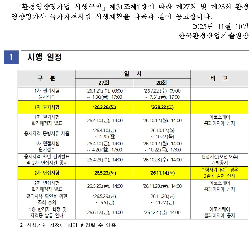 '26년(제27회ㆍ제28회) 환경영향평가사 국가자격시험 시행계획 공고 작성자백승철|작성시간25.11.18|조회수322 목록 댓글 0 글자크기 작게가 글자크기 크게가 2026년 환경영향평가사 국가자격시험 시행계획 공고문.hwp184.50KB 첨부파일첨부된 파일이 2개 있습니다. png 파일 image.png 다운로드 hwp 파일 2026년 환경영향평가사 국가자격시험 시행계획 공고문.hwp 다운로드 다음검색 현재 게시글 추가 기능 열기 북마크 공유하기 신고 센터로 신고 댓글 댓글 0 댓글쓰기 답글쓰기 댓글 리스트