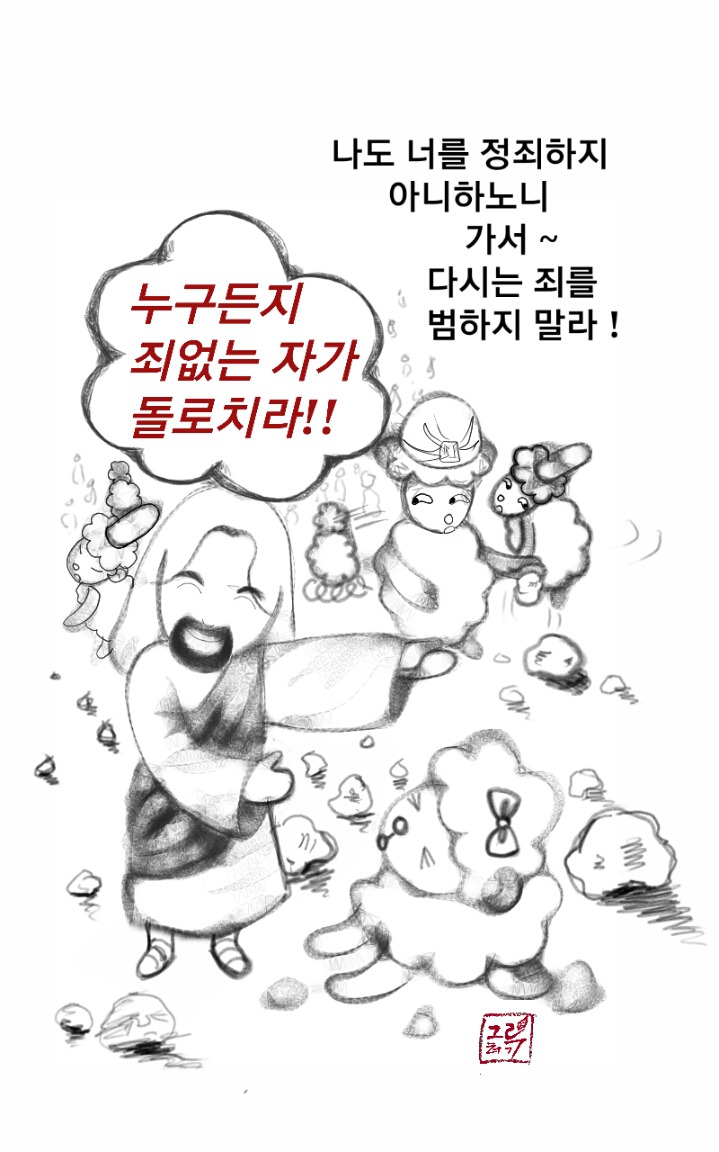 "너희 중에 죄 없는 자가 먼저 돌로 치라" 하십니다.