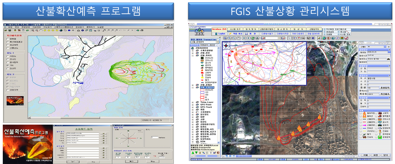 산림과학원+서울대 임업 합작인 "산불확산예측 프로그램"은 한국형으로 연구개발을 꾸준히 하는데는 이바지했으나 실용면에서는 아크프로그램 따라하듯 구축해서 산림정보 shp입력부터 무슨무슨 옵션입력과 분석 시간은 과도하고 GIS개발자의 소스라기보다는 연구목적이라 버그나 미분석 등 오류가 많아 산림청과 지자체 활용이 미비했습니다.