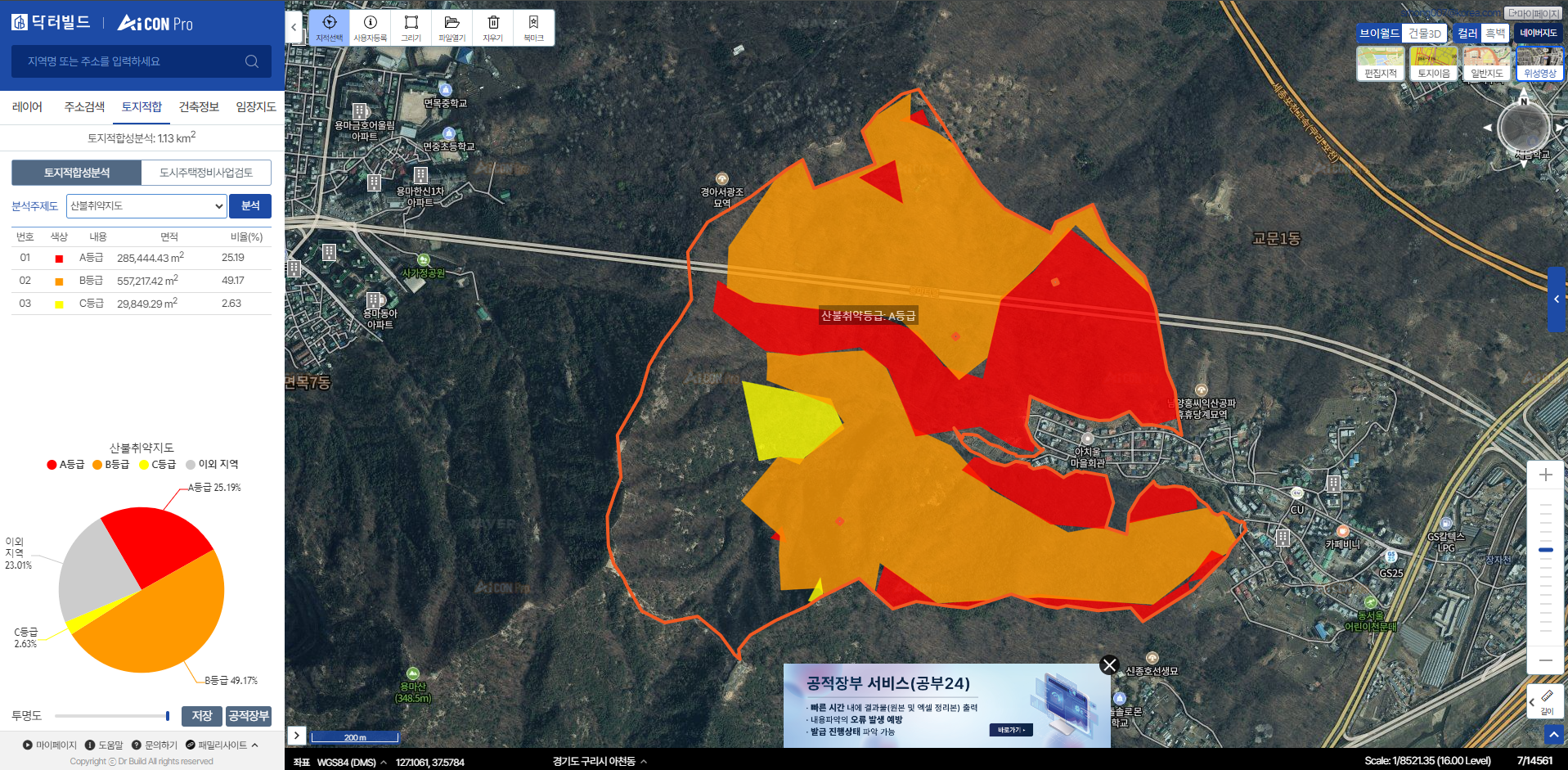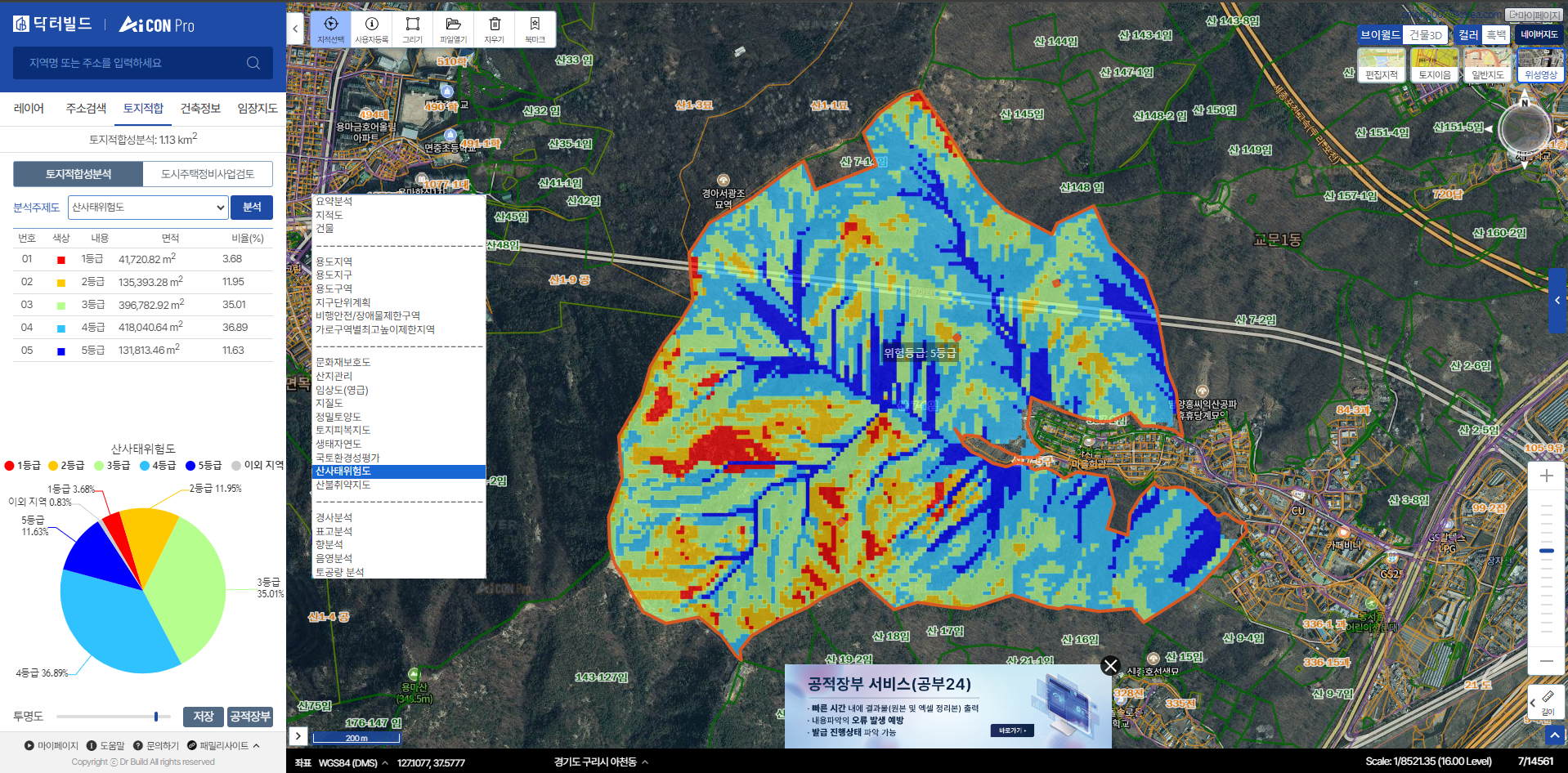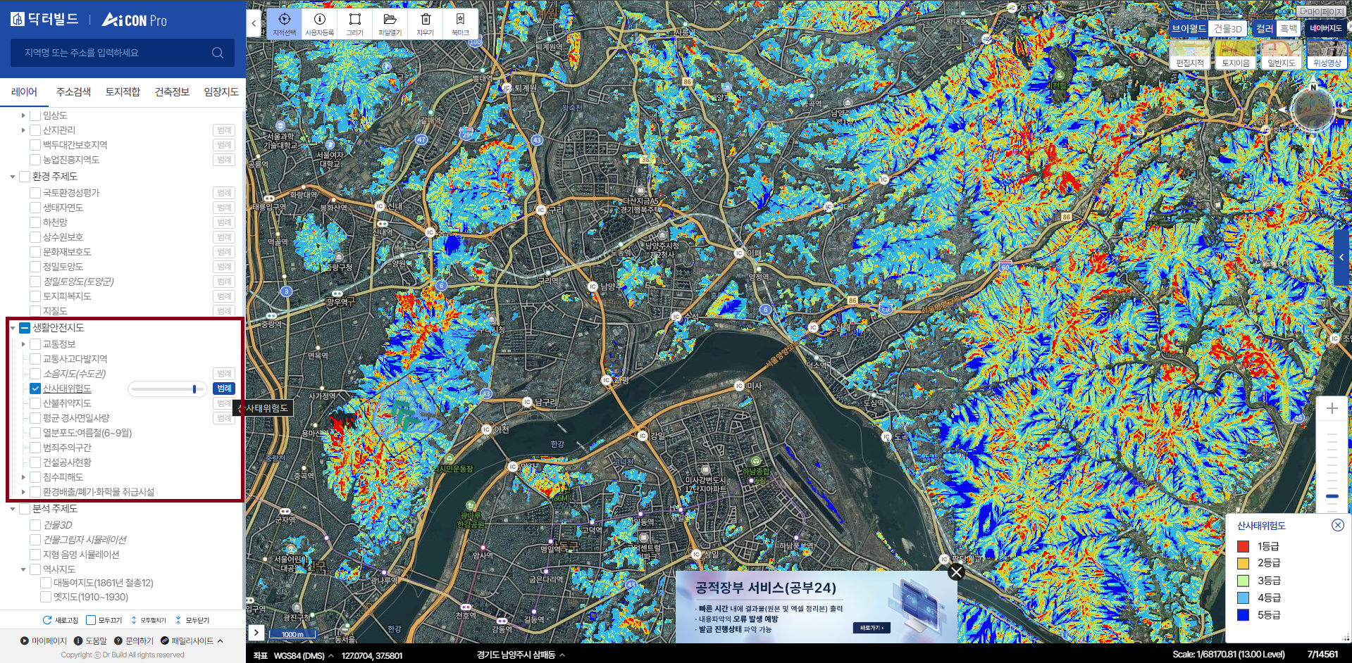 산림청의 "산림공간정보" 에서 사용중인 "산사태위험등급지도"를 본 시스템에선 중첩과 분석지의 분포를 분석합니다.