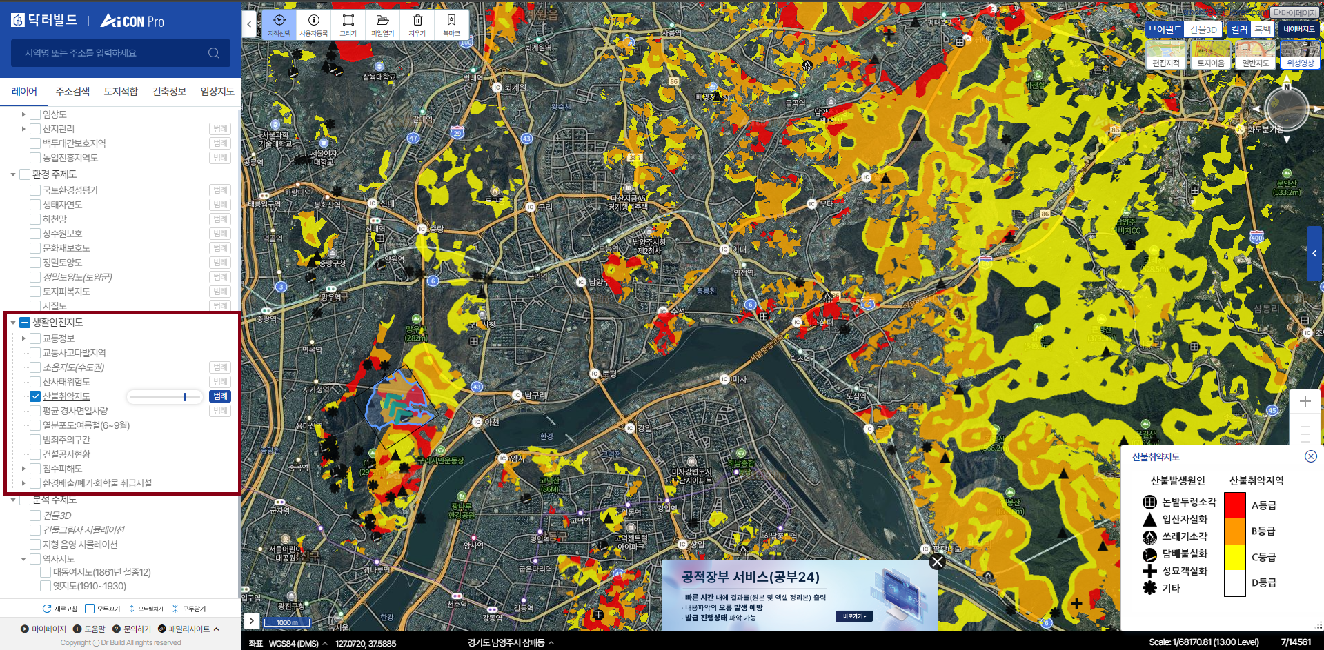 예전 부모님도 가평이나 양평에 전원주택을 꿈꾸셨는데 항상 임야지의 산불과 산사태 등 위험을 걱정하시곤 하였습니다. 본사에서는 이러한 위험도가 주위에 어떻게 분포되어 있고 건축/임야 개발시에도 최적지 선정시 고려할 하나의 요소로 분석활용하도록 설계하였습니다.