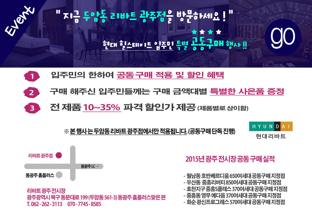 ●●현대리바트광주점(두암동) 힐스테이트 입주민 공동구매 혜택●● 작성자두암동리바트광주점|작성시간16.03.01|조회수327 목록 댓글 0 글자크기 작게가 글자크기 크게가 다음검색 현재 게시글 추가 기능 열기 북마크 공유하기 신고 센터로 신고 댓글 댓글 0 댓글쓰기 답글쓰기 댓글 리스트