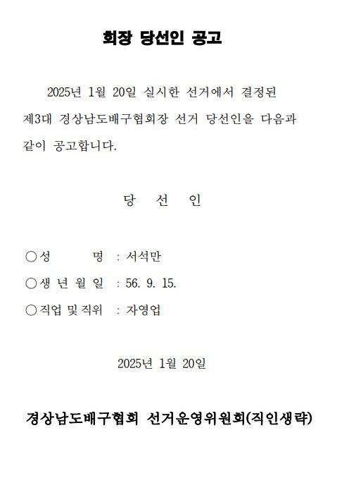 제3대 경상남도배구협회 회장 당선인 공고 작성자운영자|작성시간25.01.20|조회수175 목록 댓글 1 글자크기 작게가 글자크기 크게가 다음검색 현재 게시글 추가 기능 열기 북마크 공유하기 신고 센터로 신고 댓글 댓글 1 댓글쓰기 답글쓰기 댓글 리스트 작성자진흥건설 | 작성시간 25.03.19 회장님 축하드립니다 댓글 전체보기