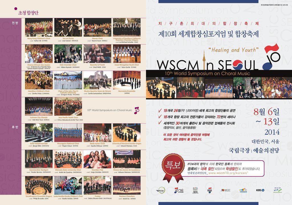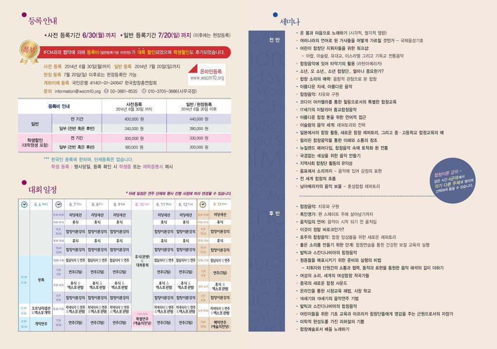 특별히, 세계합창연합회와의 협의를 통해 등록비가 한국인들만을 위해 대폭 할인 되었으며, 특히 대학, 대학원 학생들은 전에 비하여 50%의 할인률로 등록할 수 있습니다.