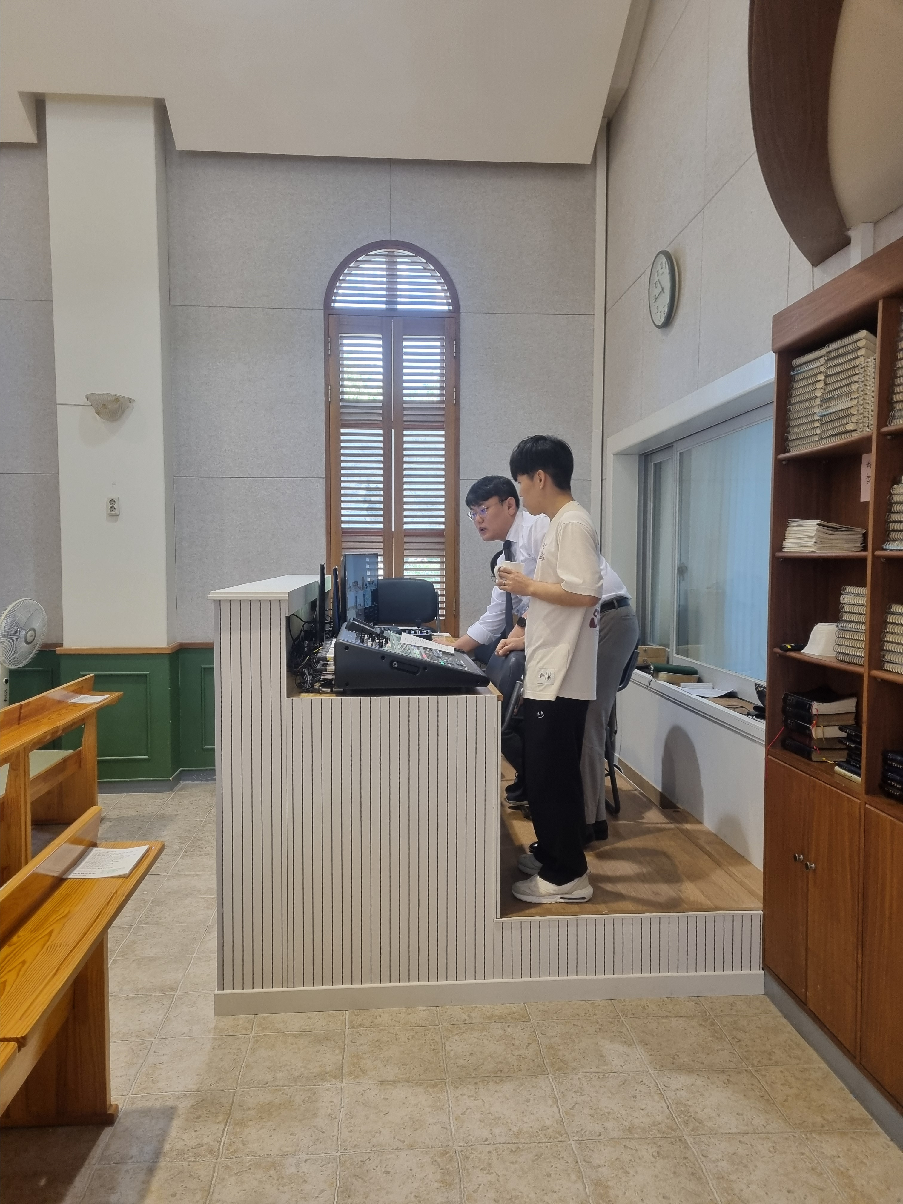 주일날 음향 영상 준비중이신 박철주권사,이건원전도사,정종원청년의 모습입니다.