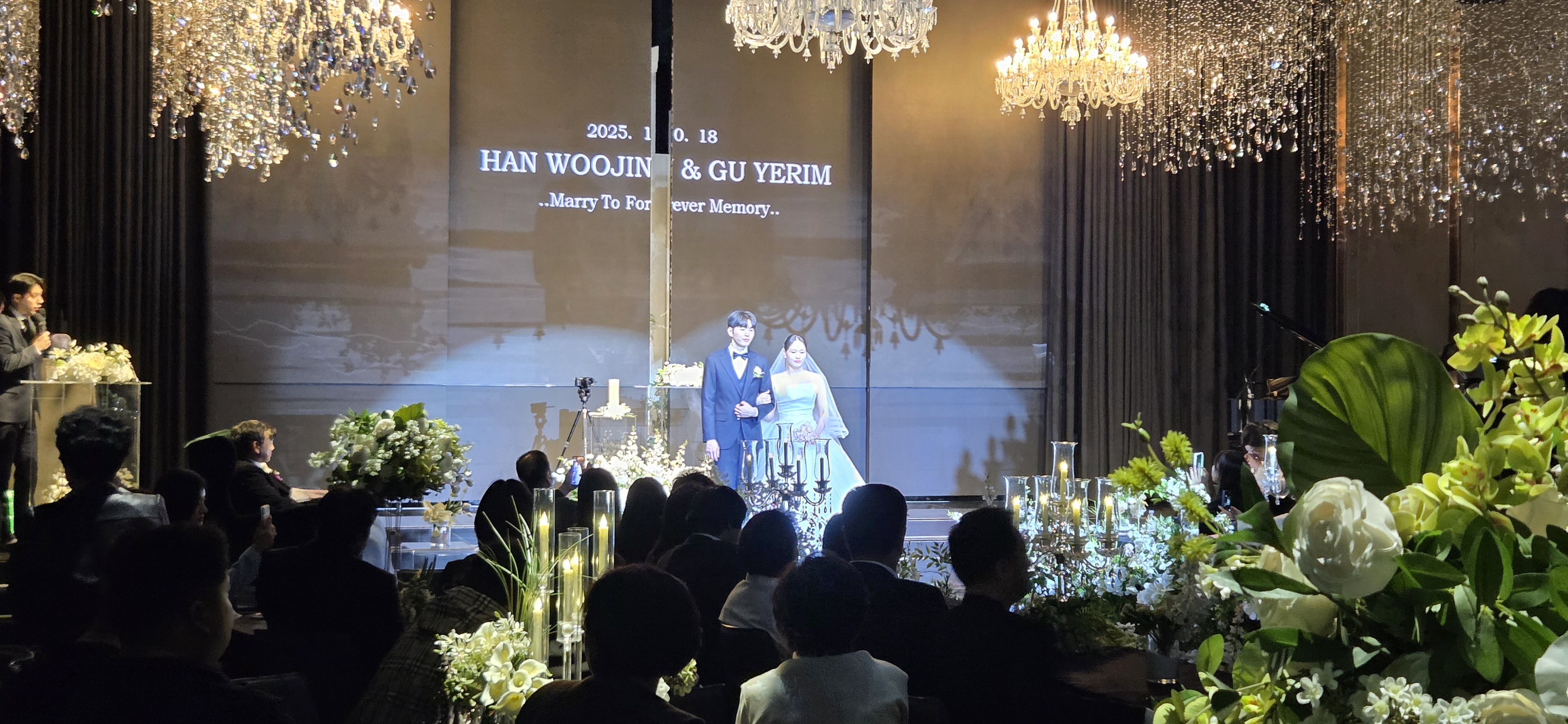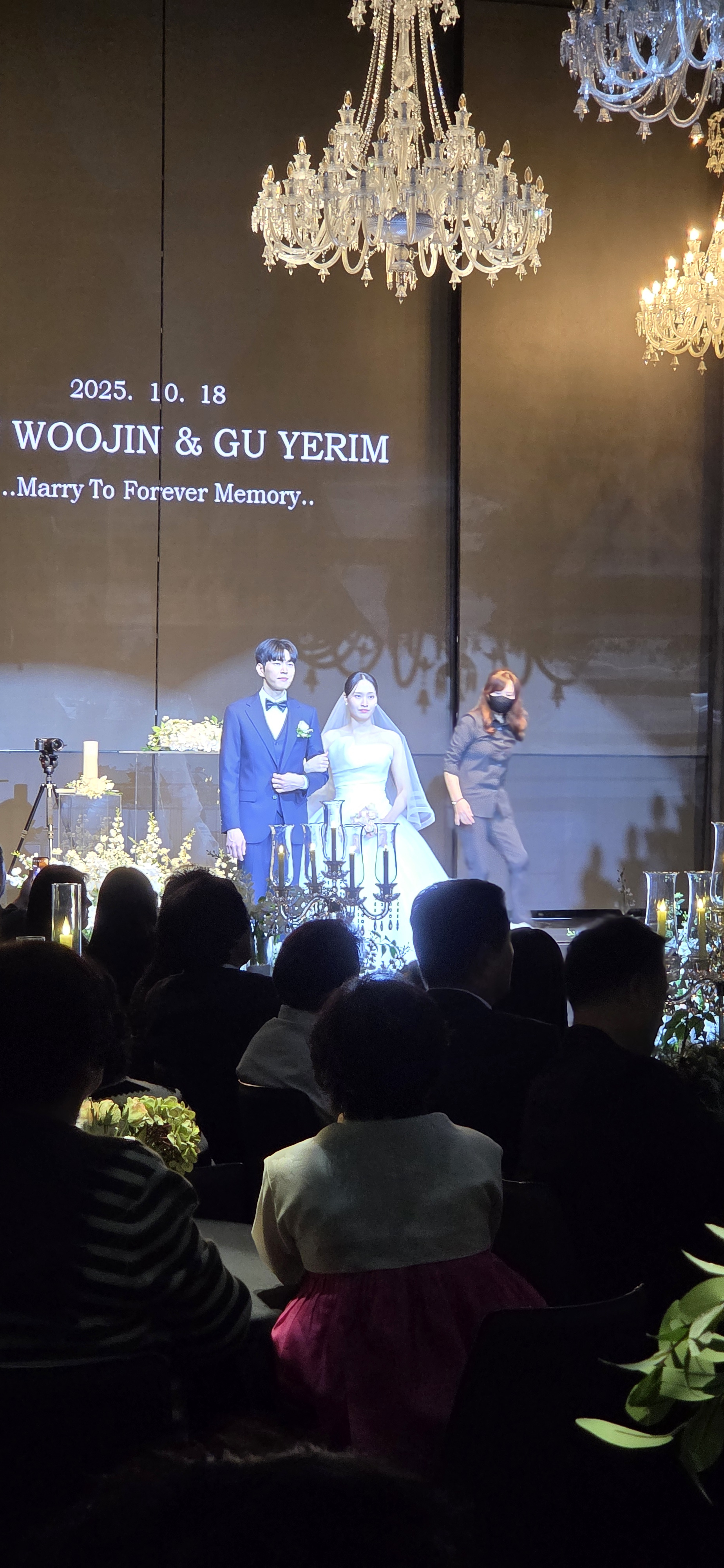 구제군 아버지의 팔을 붙잡고 신부 입장하는 예림양의 모습은 피로연장에서 스크린으로 봤습니다. 늘씬하고 아름다운 신부였습니다.제가 들어가서 사진을 찍을 땐 신랑 신부가 퇴장하기 직전이었습니다. 내빈 여러분들께 인사하며 퇴장하고,아름답게 포토를 찍는 모습을 볼 수 있었습니다. 아름다운 한 쌍의 가정이 탄생하고,신랑 신부의 행복과 사랑을 축복하면서,저희는 다시금 교회로 향했습니다. 두분 정말 축하드립니다.항상 주의 사랑안에 머물며,서로 서로 아끼며 백년해로하시기 바랍니다.