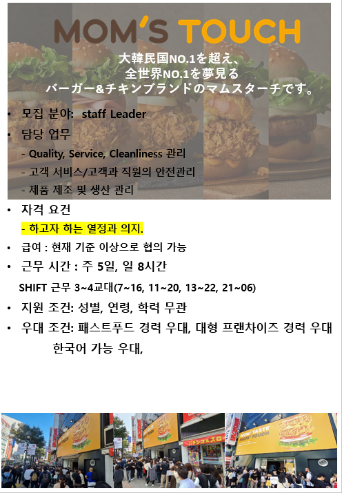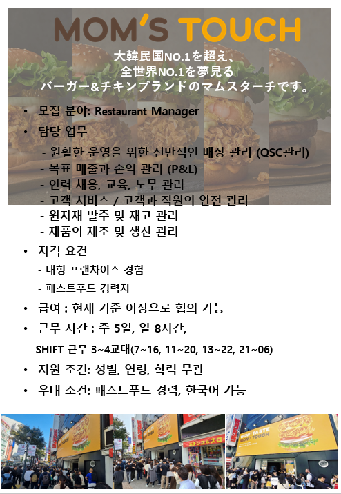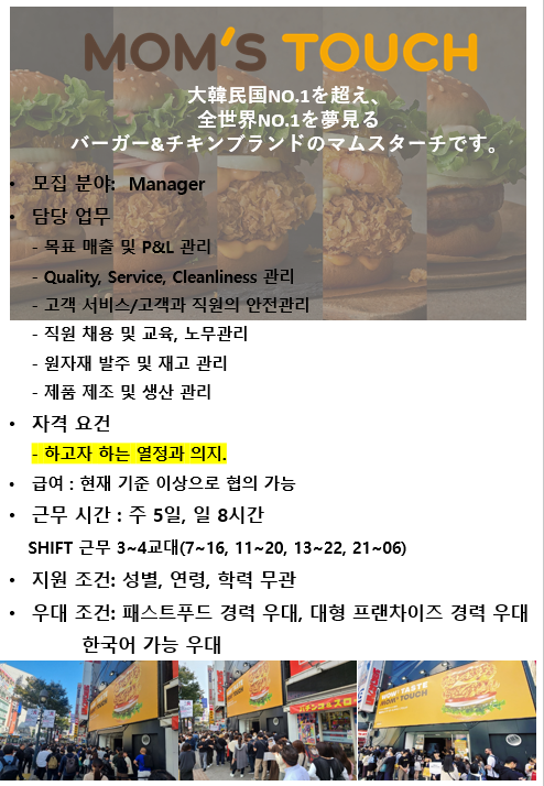 [도쿄/시부야] 맘스터치 채용 공고 작성자MOMSTOUCH|작성시간24.02.03|조회수115 목록 댓글 0 글자크기 작게가 글자크기 크게가 카카오: hi_riel 다음검색 현재 게시글 추가 기능 열기 북마크 공유하기 신고 센터로 신고 댓글 댓글 0 댓글쓰기 답글쓰기 댓글 리스트
