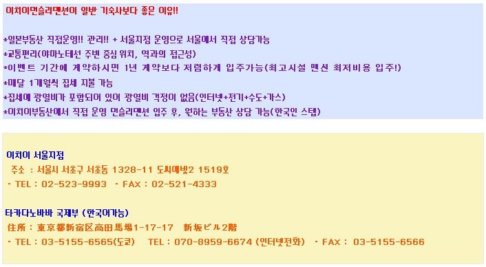 ・東京メトロ日比谷線「広尾」 히로오역 : 도보 12분 ・東京メトロ南北線「白金高輪」시로가네타카나와역 : 도보 12분 |
