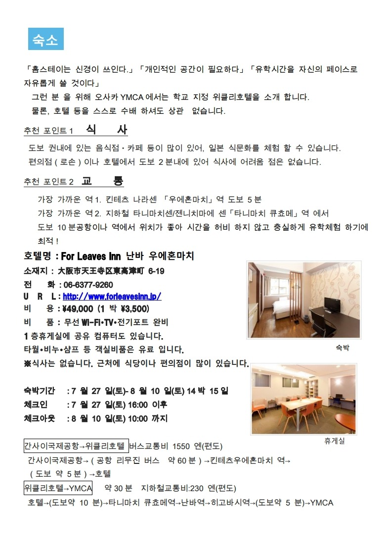 오사카YMCA일본어학교에서 여름방학 2주코스인 하기단기어학연수를 오픈한다고 합니다.