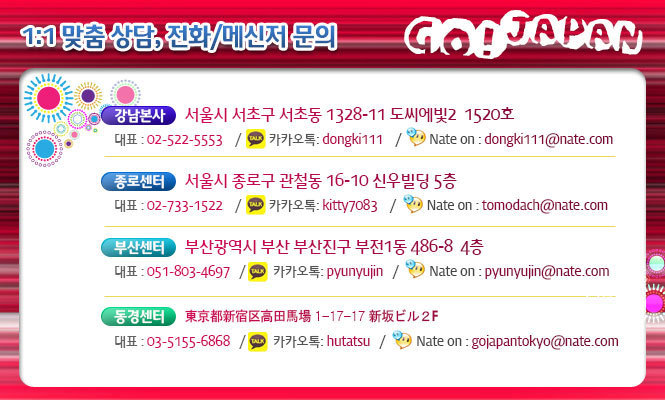 4. 1월학기 출국을 희망하시는 분은 서둘러 일본어학교 또는 기숙사를 상담 받으셔야 합니다. 가까운 고재팬일본유학 센터(강남, 종로, 부산, 동경)에 문의해주세요. |