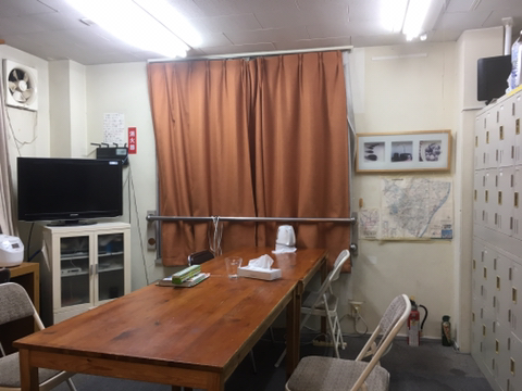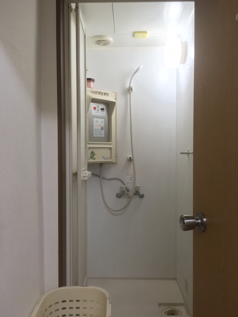 공용거실 한쪽에 샤워실이 있습니다. 코인식이고 100엔에 10분입니다. 버튼으로 물을 멈춰두면 시간이 흐르지 않기 때문에 샤워하기 충분하다고 봅니다.