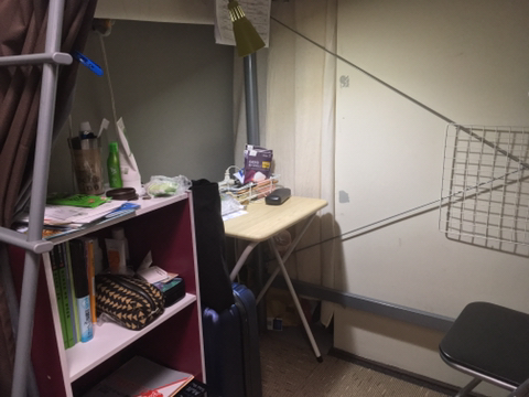 도미토리는 대부분의 침대가 로프트베드로 되어있어서 개인공간이 확보가 됩니다. 이 로프트베드에서 한달에 야칭과 관리비 합쳐 36,000엔 내며 살고 있습니다.