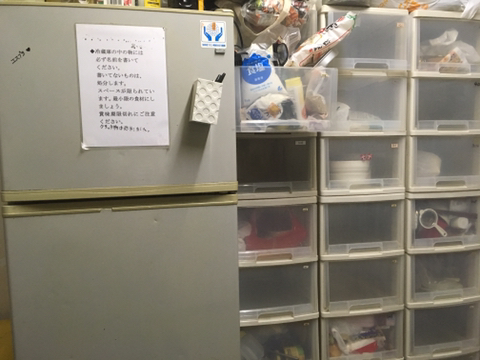 주방에는 조리도구와 전자렌지, 토스터기등이 있어요. 큰 냉장고가 두 대나 있어서 음식을 보관하는데 곤란하지는 않습니다. 냉장고 옆쪽 보관함은 상온재료를 보관해두는 곳인데, 각 호실별로 한 칸을 씁니다.