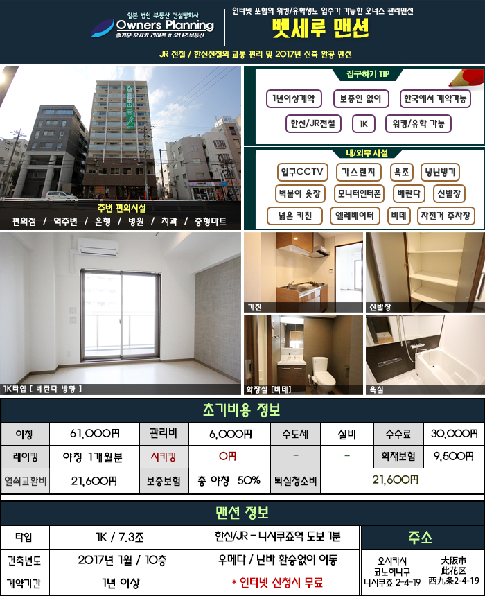 2017년 1월을 시작으로 새롭게 오픈하게 된 벳세루 맨션은 오사카 오너즈 부동산의 단독 관리 맨션으로써,