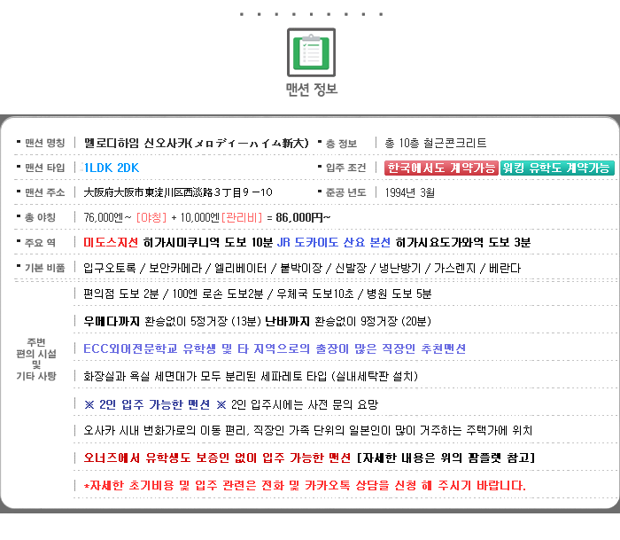 1R / 1K / 1DK / 1LDK 등 1인 가구도 많은 일본이니만큼 1인 가구에 맞춘 방 1칸짜리의 맨션이 주를 이룹니다. 물론 다이닝 키친룸, 리빙 다이닝 키친룸 등을 뜻하는 DK LDK 타입의 경우엔 한국의 거실과 같은 개념으로 생각하면 되기 때문에 1DK 1LDK 타입부터는 2인 입주가 가능한곳이 많고 자매나 형제끼리, 신혼부부끼리 거주하는 경우가 많답니다. 오사카집구하기 하실때는 기본적으로 2인 입주가 가능한 맨션들은 그 2인이 가족에만 해당되는 경우가 많아 친구끼리도 함께 입주가 가능한지 사전에 잘 알아보고 문의해보셔야 합니다. 오늘 소개해드릴 멜로디하임 신오사카는 2인 입주가 가능해요.