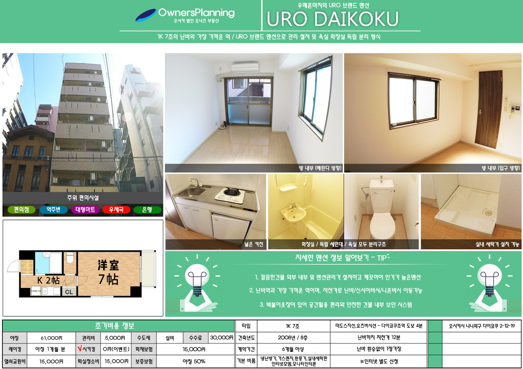 <오너즈부동산>[다이코쿠초역 도보6분] 1K 7조 / 난바 1정거장 / 인터넷무료 / 벽붙이옷장 / 욕실,화장실 분리 / 월 야칭 61,000엔~ [관리비 포함] 동영상有